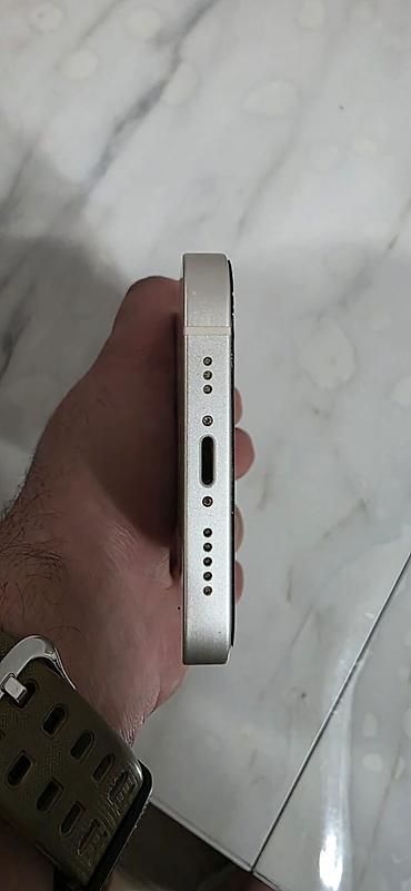 Apple iPhone (ağ rəng) - pil 99% - İkiqat arxa kamera modulu (diaqonal yerləşim), LED flaş - Parlaq şüşə arxa panel, düz alüminium kənarlar - USB‑C aşağı hissədə, stereo səsgücləndiricilər - Sol kə...