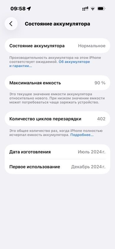 - Batareya məlumatı (screenshotda): maksimal tutum 90%, doldurma dövrləri 402; istehsal tarixi – İyul 2024, ilk istifadə – Dekabr 2024