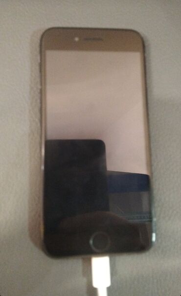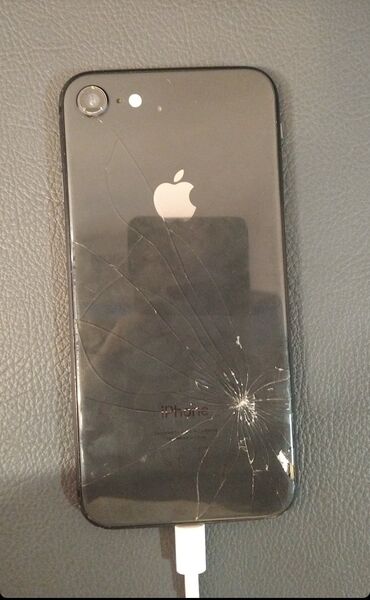 Apple iPhone (qara rəng). Ekranın aşağı hissəsində Home düyməsi olan model. Arxa panel şüşə korpuslu, solda tək linzalı kamera, LED flaş və mikrofon yerləşir. Lightning portla enerji yığır (şəkildə kabel qoşuludur). Arxa şüşədə çatlar mövcuddur. Ön tərəfdə ekranın yuxarı hissəsində ön kamera və dinamika var. Kompakt ölçülü, barmaq izi skaneri olan Home düyməsi, Lightning giriş, səs tənzimləmə düymələri və yan kilid düyməsi ilə standart iPhone funksionallığı. Qara rəngli korpus, arxa tərəfdə “iPhone” və Apple loqosu. 30 manat xərc təleb eləyir arxa krisqa bide korpus bele isdeyir ideal telefondu barter var