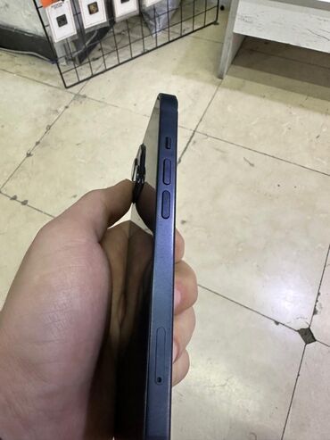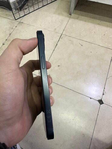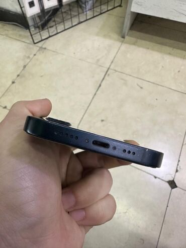 Apple iPhone (qara rəng). Kompakt gövdə və düz kənar dizaynı. Arxada diaqonal yerləşimli ikili kamera bloku və LED fləş. Ön tərəfdə Face ID kəsiyi olan tam ekran.