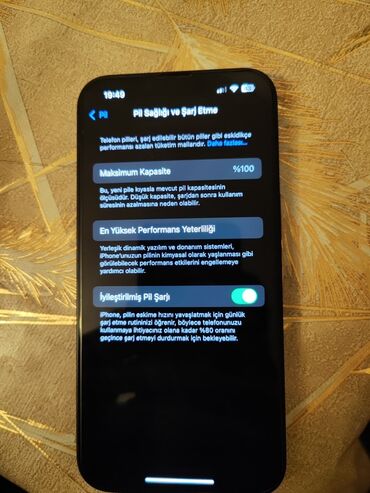 - Batareya: Ayarlar bölməsində “Pil sağlamlığı və şarj etmə” hissəsi göstərilir; “Maksimum kapasite: 100%”, “Ən yüksək performans yeterliliyi” aktivdir; “İyileştirilmiş Pil Şarjı” funksiyası açıqdır
