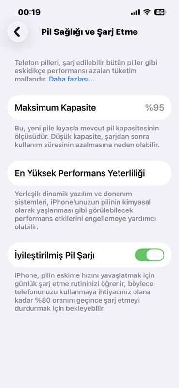 IPhone – Pil Sağlığı və Şarj Ekranı (screenshot) - Maksimum kapasite: 99% - En Yüksək Performans Yeterliliyi aktivdir - İyileştirilmiş Pil Şarjı funksiyası açıqdır Detallar: - iPhone-un batareya ...