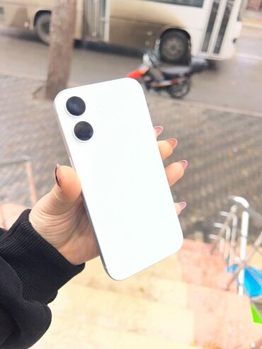 Apple iPhone (ağ rəng) - Korpus: şüşə arxa panel, alüminium çərçivə, ağ rəng - Arxa kamera sistemi: 2 linza (geniş + ultra‑geniş), LED flaş - Ön kamera: ekran üstündə mərkəzi çıxıntıda (notch) yer...