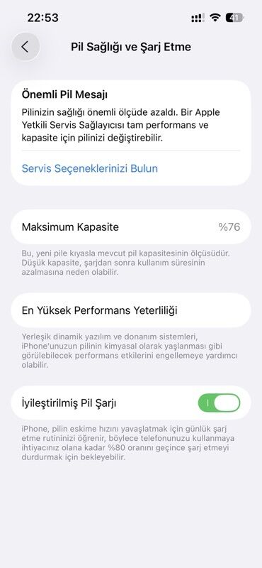 - Batareya bölməsi görüntüsü: Maksimum Kapasite 76% (ekranda “Pil Sağlığı ve Şarj Etme” səhifəsi, “Önemli Pil Mesajı” və “İyileştirilmiş Pil Şarjı” aktivdir)