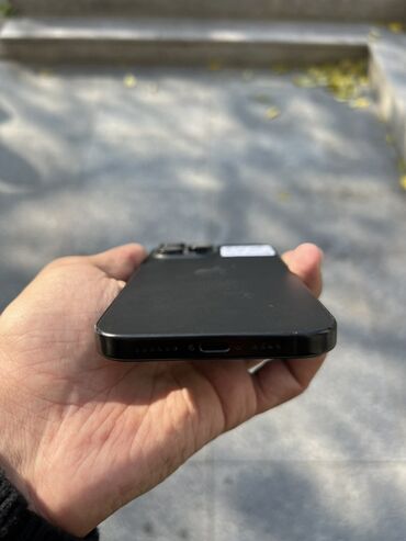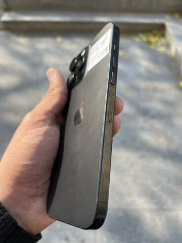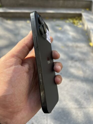 Apple iPhone (Pro seriyası, qara rəng). Arxa paneldə üçlü kamera bloku və LiDAR skanı mövcuddur. Yanlarda səs idarəetmə düymələri və səssiz rejim keçidi. Alt hissədə USB‑C portu və stereo hoparlör qəfəsi görünür.