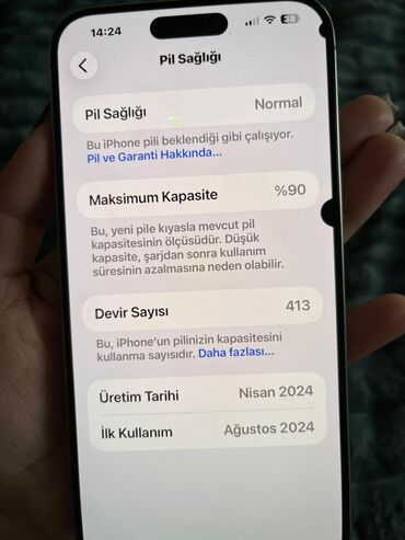 - Batareya məlumatı (ekrandan): Pil Sağlığı – Normal; Maksimum tutum 90%; Dövr sayı 413; Üretim tarixi Nisan 2024; İlk istifadə Avqust 2024