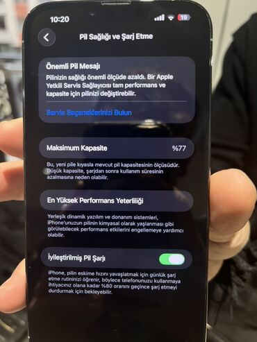 - Batareya bölməsi: telefonda “Pil Sağlığı və Şarj Etmə” ekranı göstərilib; maksimum tutum 77% yazılır, iPhone batareyəsinin dəyişdirilməsi ilə bağlı xəbərdarlıq mesajı görünür