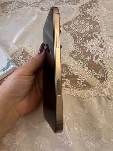 Apple iPhone (Pro seriyası) - Rəng: qızılı/bej ton - Korpus: cilalanmış metal çərçivə, şüşə arxa panel - Ekran: tam ekran OLED, Dynamic Island kəsiyi - Kamera sistemi: arxada 3 linzalı pro kamera ...