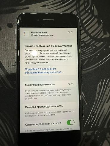 Ekran və korpus şəkillərdə göstərilib. Akkumulyator bölməsində maksimum tutum 76% yazılır; pik performans normaldır. Telefon menyuları rus dilində qurulub, App Store, FaceTime və digər standart tətbiqlər mövcuddur.