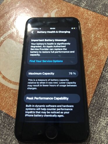 - Batareya: Battery Health & Charging bölməsində maksimum tutum 78% göstərilir; “Important Battery Message” bildirişi görünür.