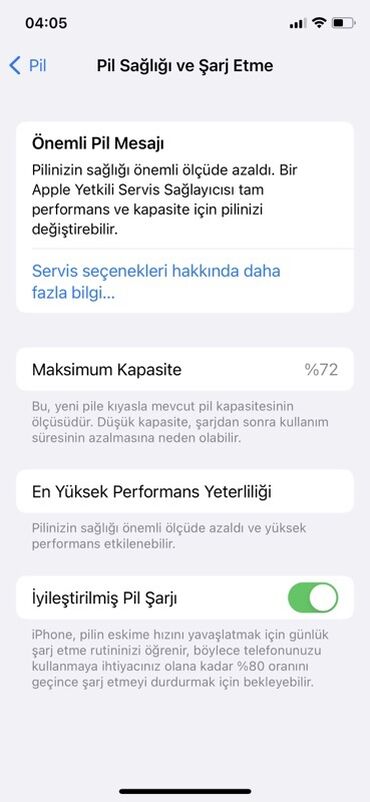 - Batareya bölməsi: Maksimum tutum 72% (Pil Sağlığı və Şarj etmə səhifəsi şəkillərdə)