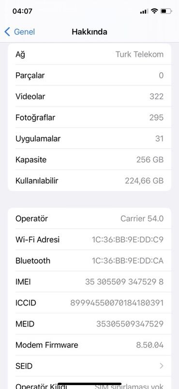 - Yaddaş: 256 GB (224,66 GB boş yer göstərilir)