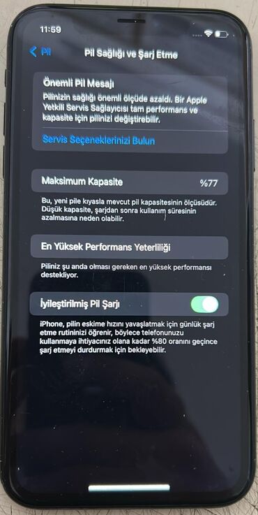 - Batareya məlumatı (ekrandan): Maksimum tutum 77%, “İyileştirilmiş Pil Şarjı” aktiv, “En Yüksek Performans Yeterliliği” göstərilir