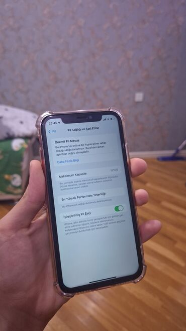 - Batareya: Batareya sağlamlığı 100% (ekranda göstərildiyi kimi). Bildirişdə “bu iPhone‑un orijinal Apple pilinə sahib olduğu doğrulanmır” qeyd olunur