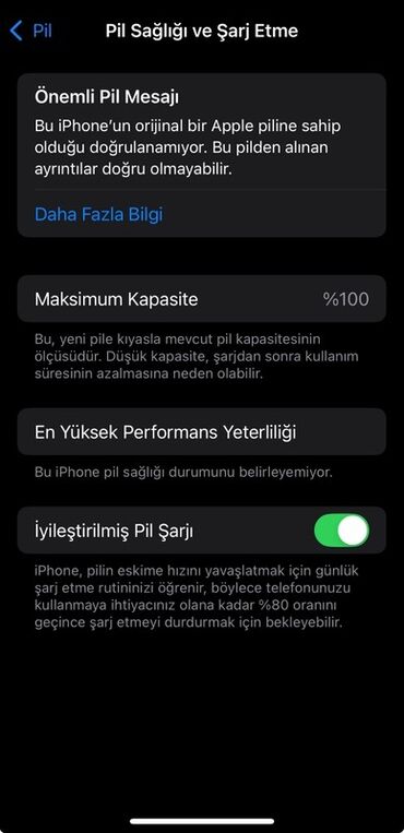 - Batareya: İdarəetmədə Maksimum Kapasite 100% göstərilir; ekran görüntüsündə “orijinal Apple pili təsdiqlənə bilmir” bildirişi mövcuddur; “İyiləşdirilmiş Pil Şarjı” aktivdir