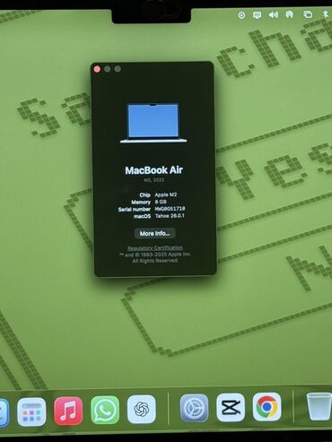 - Ekranda sistem məlumat pəncərəsi “MacBook Air M2, 2022” və 8 GB yaddaşı təsdiqləyir