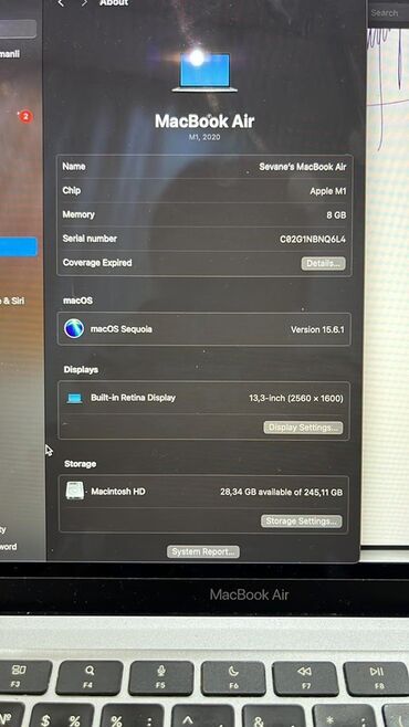- Daxili yaddaş: 256 GB SSD (Macintosh HD – görüntüdə 245 GB)
