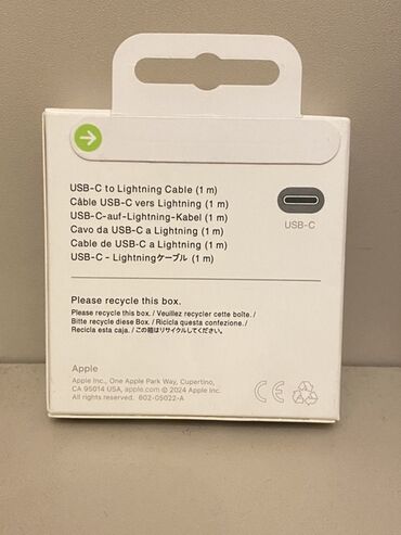Rəsmi Apple qablaşdırması. 2024 Apple Inc. qeydiyyat məlumatları qutuda göstərilib. Qutunun təkrar emalı üçün işarələr mövcuddur.