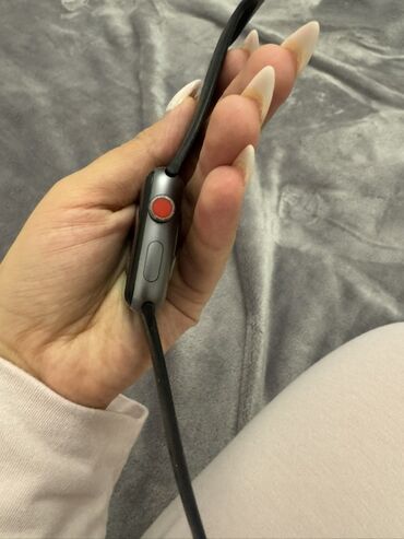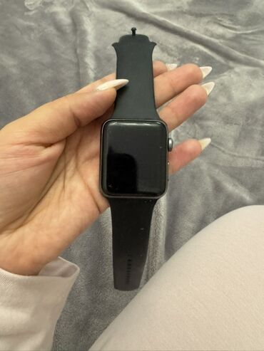 Apple Watch Series 3, 42 mm, Space Gray Alüminium korpus və qara silikon idman qayışı.