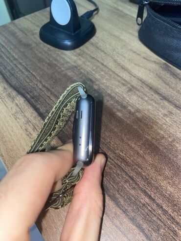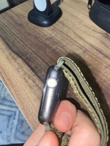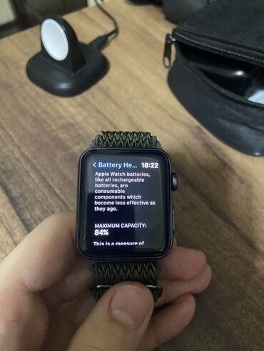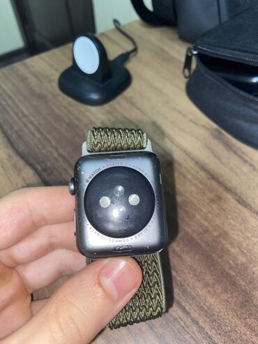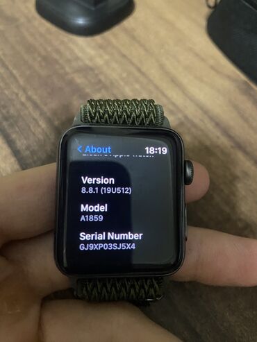 Bu, 42 mm Apple Watch Series 3 A1859 modelidir, watchOS 8.8.1 ilə işləyir. Şəkillərdə qurğunun real görüntüləri, sensorlar, yan düymələr və şarj stendi əks olunub.