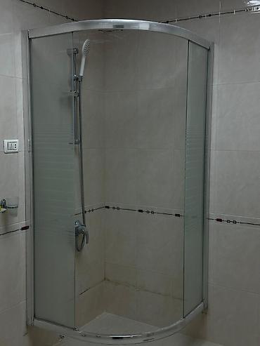 - Künc tipli, yarımdairəvi duş kabinəsi: sürüşən şüşə qapılar, alt palet, yağış duş başlığı; məxfilik üçün zolaqlı mat şüşə hissələr.