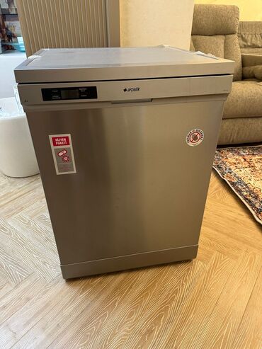 Arçelik qabyuyan maşın – Xrom/Silver korpus, sərbəst quraşdırılan model (A+ enerji sinfi qeydli). Ön paneldə LED göstərici və toxunma düymələri, proqram seçimi və vaxt taymeri var.