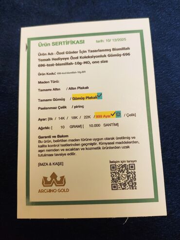 - Sertifikat: Ürün Sertifikası mövcuddur – ayar 999, çəki 10 qram qeyd olunub