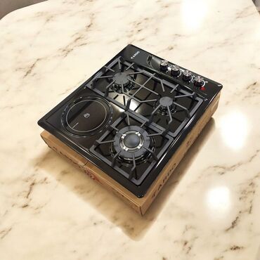 EZEL quraşdırılan qarışıq soba paneli - Yanacaq növü: 3 qaz ocağı + 1 elektrikli disklik (solda) - İdarəetmə: sağ zolaqda 4 ədəd fırlanan mexaniki düymə - Alov mənbələri: fərqli ölçülü üç qaz gözü...