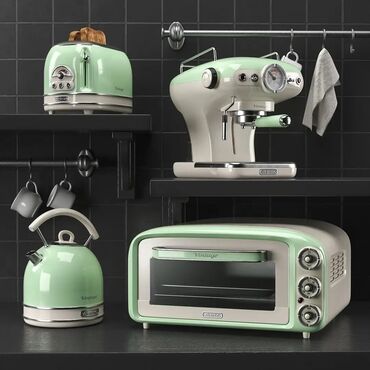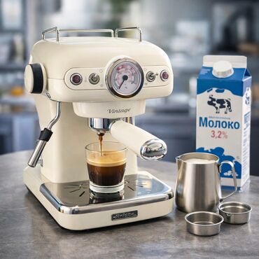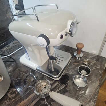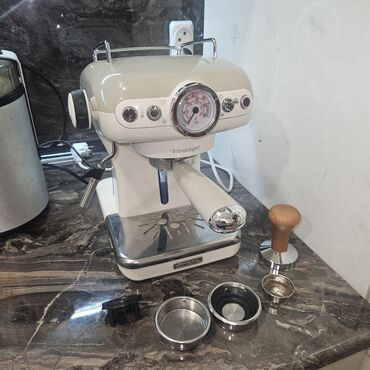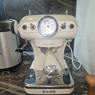 Ariete Vintage Espresso Machine 1389 . Retro dizaynlı (1950-ci illərin üslubunda), krem rəngli, kompakt və şık qəhvə maşını. Bu vintaj qəhvə maşını, digər vintaj mətbəx texnikası ilə birgə, mətbəxinizə şık dizayn əlavə edəcək. İtalyan firması Ariete məşhur DeLonghi şirkətinə məxsusdur. Mətbəxinizi bəzəyəcək və ləzzətli espresso hazırlayacaq.