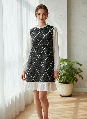 SATILIR! Trendyoldan alinib. Bir defe geyinilib. Materiali chox gozeldir, gundeliye geyinmek olar. Armonika brendindən qara və ağ rənglərdə romb naxışlı, uzunqol don. Donun ağ rəngli, büzməli yaxalığı və manjetləri var. Etek hissəsi büzməli, ağ rəngli parçadan hazırlanıb. Bu don gündəlik istifadə üçün uyğundur.