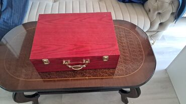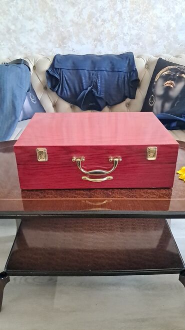 - Qutusu: Bordo rəngli taxta çamadan, üst bölmə + alt dartılan çekmece, metal tutacaq və kilidlər