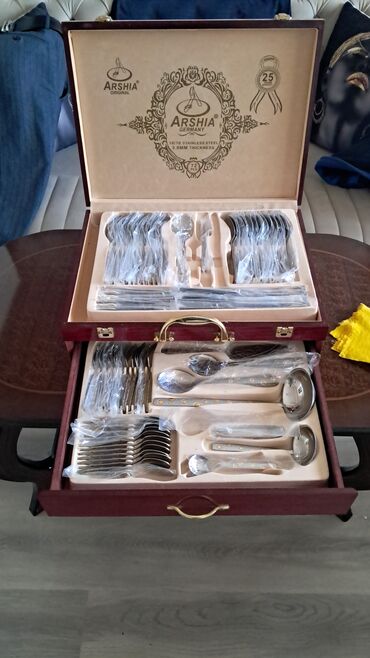 Şık taxta çamadanda saxlanılır, hədiyyəlik və günlük/ziyafət süfrələri üçün tam komplektdir.