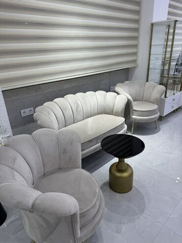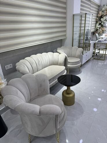 Məhsul: Şenil/velür üzlü, qlamur dizaynlı salon divanları və kreslo - Stil: Art-deko ilhamlı, yumru xətli “mid-century” forması, qabıqvari (scallop) bel dayaqı - Material: Yumşaq velür/şenil parça...