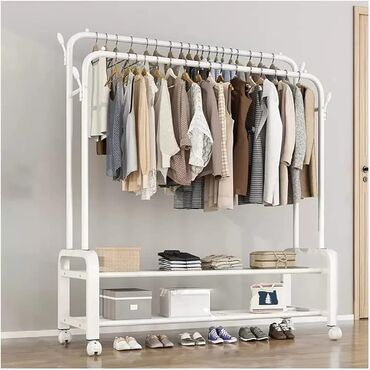 Asılqan rəf ikili Böyük Tutumlu istənilən yerə uyğun gəlir və uzun asılqan rels köynəkləri, şalvarları, paltoları və digər uzun paltarları saxlaya bilər. Rəflərin alt qatı ayaqqabıları, saxlama qutularını və digər əşyaları saxlamaq üçün uyğundur. Yanlarında çanta, papaq və s. saxlamaq üçün 4 qarmaq var.