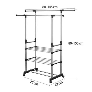Tənzimlənən hündürlük. 4 yuvarlanan təkər ilə paltar relsini rahatlıqla istənilən otağa köçürə bilərsiniz, 2 təkər kilidlənə bilər.