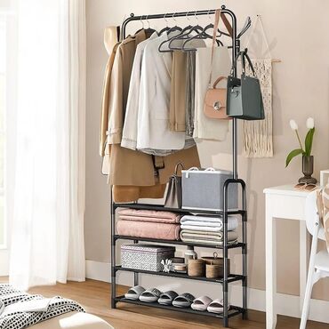 Yanlarda 2 qarmaq və paltar asmaq üçün üst çubuğuna bölünmüş müxtəlif saxlama variantları.