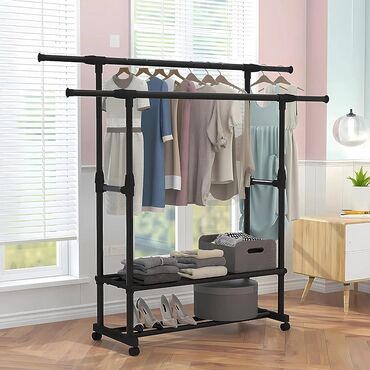 MÜMKÜNLƏR: Yuvarlanan paltar rəfi möhkəm metal çubuqlarla hazırlanır. Geniş ikiqat çubuqlu paltar şkafı heç bir narahatçılıq olmadan çoxlu paltar saxlaya bilər.