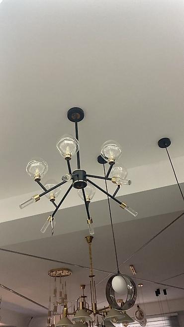 - Müasir/loft üslubunda çilçıraq: mat qara metal konstruksiya, qızılı vurğular, fərqli bucaqlarda yerləşdirilmiş qollar və şüşə plafon elementləri. E27/E14 tipli lampalara uyğun (şəkildə iki fərqli tipli ucluqlar görünür), geniş məkanlarda bərabər yayılmış işıq effekti yaradır.