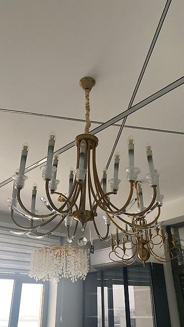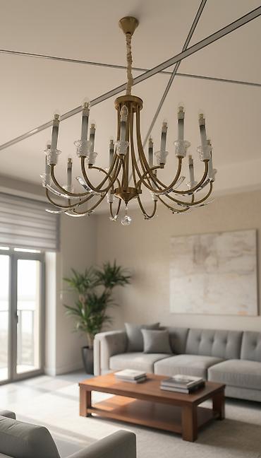 - Klassik üslubda, çoxşaxəli böyük çilçıraq: fırçalanmış qızılı gövdə, şüşə dekorlu şam formalı lampholderlər, aşağı hissədə kristal asqılar. Yüksək tavanlı qonaq otaqları, zal və restoran interyerləri üçün uyğundur. E14 patrondur, çoxsaylı lampalaşdırma imkanı ilə güclü işıqlandırma yaradır.