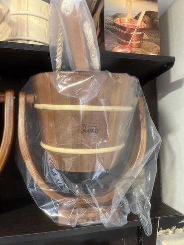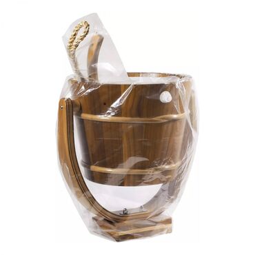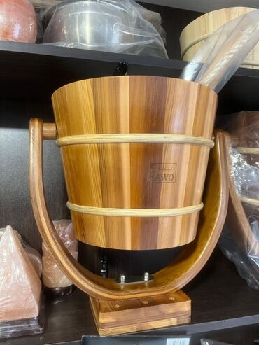Sauna üçün şok vedrə – asma tipli, taxta korpuslu - Material: təbii ağac (yivli taxta lamellər), daxildə suya davamlı plastik/kompozit kasa - Divara bərkidilən asqı konstruksiyası və yellənmə mexa...