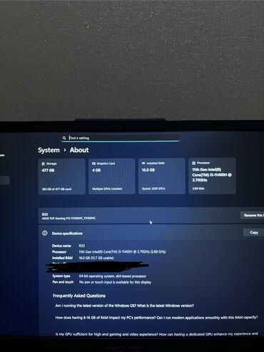 • Yaddaş (Storage): 512GB NVMe SSD – sürətli yükləmə, proqramların tez işləməsi və oyunların rahat quraşdırılması üçün.
