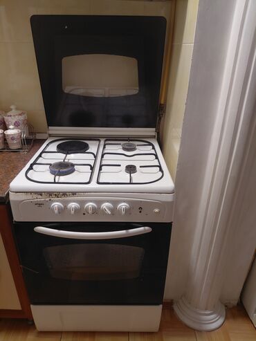 Mətbəxdə gündəlik yemək bişirmə və bişdirmə üçün funksional, sadə idarə olunan qaz plitəsi-soba kombinasiyası.
