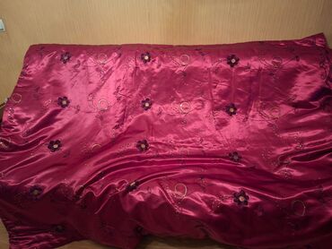 İkiüzlü yorğan - Ölçü: təxminən iki nəfərlik (şəkildə böyük ölçülü, döşəməni tam örtür) - Material: parlaq atlas tipli parça - Rəng və dizayn: - Bir üzü tək rəngli qırmızı, üzərində zərif naxışl...
