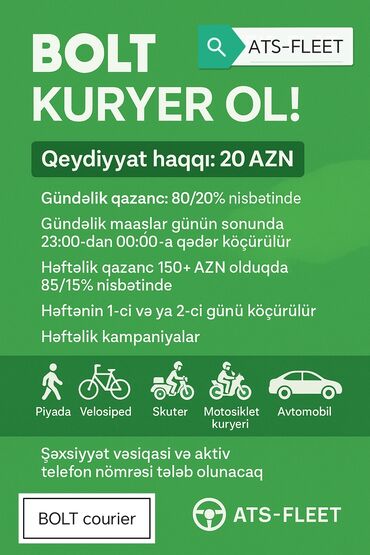 ATS-Fleet – Bolt üçün kuryer işçiləri axtarılır... Qeydiyyat haqqı 20 AZN - Etibarlı gəlir: gündə 20–70 AZN arası - 20% komissiya - 1 günə işə başla - Qoşulmaq üçün WhatsApp yazın (şəkildə göstər...