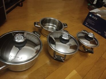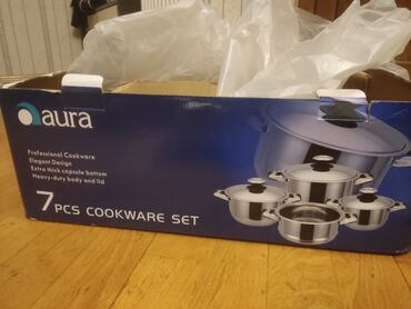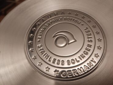- Material: Stainless Solingen Steel (Almaniya). Qazanların dibində “AURA • EXTRA CAPSULE BOTTOM • STAINLESS SOLINGEN STEEL • GERMANY” işarəsi.