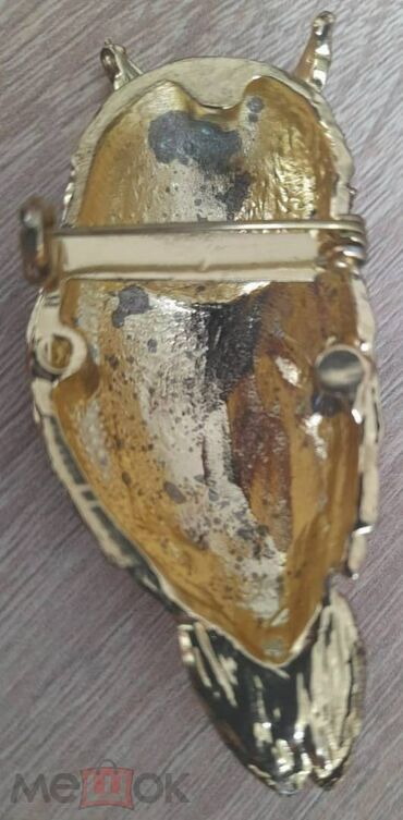 Qızıl rəngli metaldan hazırlanmış gözəl vintaj bayquş brossu. Detallar zərif işlənib, göz hissəsində dekorativ daşlar var. 1970–1990-cı illərin Avropa istehsalıdır.
