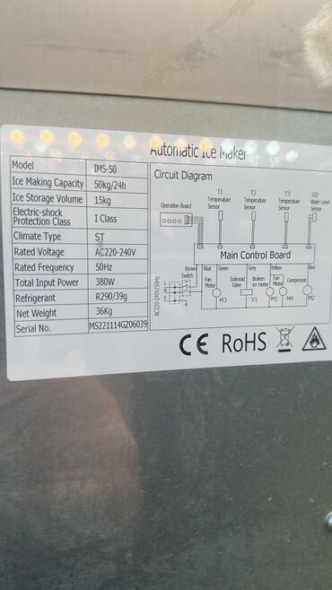 Qar buz makinası. Avtomatik qar buz hazırlayan aparat. Model IMS-50. Buz hazırlama gücü 24 saat ərzində 50 kq-dır. Buz saxlama həcmi 15 kq təşkil edir. Soyuducu maddə olaraq R290/39q istifadə olunu...