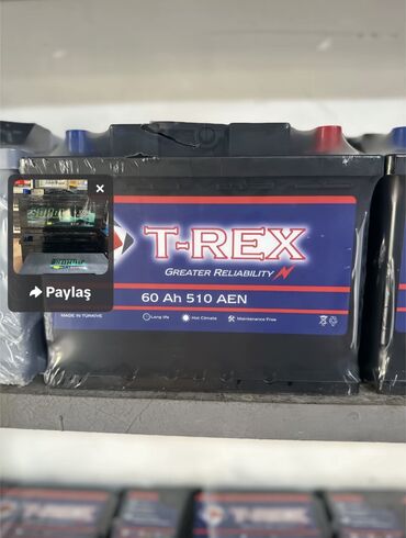 - T-REX 60Ah 510A EN/AEN, 12V. Üstündə “Greater Reliability”, “Long life”, “Hot Climate”, “Maintenance Free” nişanları. İstehsal: Turkey.