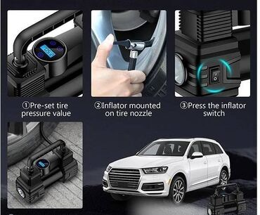 🔹 Kompakt avtomobil kompressoru fənər, avtomobillər, velosipedlər, qayıqlar, kvadrosikllər, motosikletlər üçün adapterləri olan şlanq və şişmə döşəklə təchiz edilmişdir. 50 litrlik elektrik yağsız nasos tez açılan ucluq və müxtəlif tətbiqlər üçün əlavələrlə təchiz edilmişdir. O, elektron təzyiq sensoru ilə təchiz edilmişdir - təkərləri şişirdərkən və ya pompalayanda dəqiq nəzarət üçün manometr.