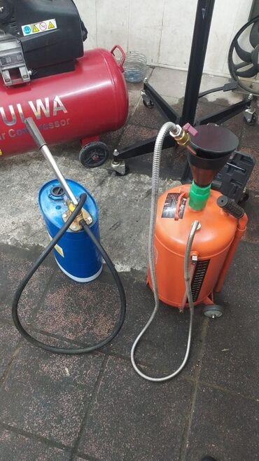 - Yağ toplama və/və ya vakuumla yağçıxarma qurğuları – biri narıncı, biri mavi rəngdə mobil çənlər, şlanq və nasos qoluyla. Həcmi korpus üzərində miqyas göstəricisi ilə işarələnib.